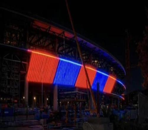 其中一项重要工程是外墙照明系统。目前测试工作已启动,相关效果图显示,装饰面板在点亮后能够呈现鲜明的红蓝色调。这些面板将作为三层看台外立面的装饰元素,进一步提升球场的夜间形象。目前仍有部分饰板尚未安装完毕。